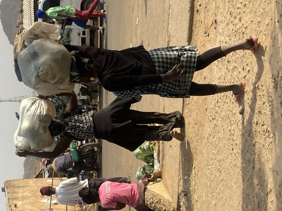 Two women balance large sacks on their heads while walking, one wearing a black top and blue checkered skirt and the other in a printed top and black skirt. People mill about, including one in a pink shirt. A white vehicle and motorcycles are visible, along with produce. The scene unfolds outdoors on what appears to be a dusty road or market area.