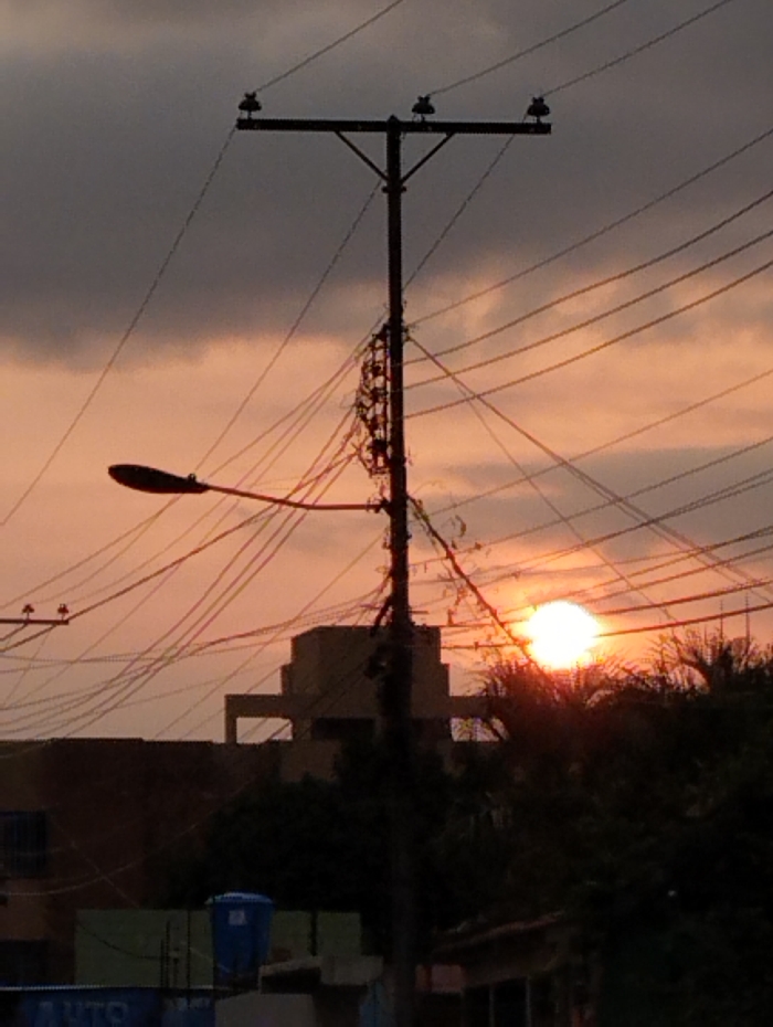 The image depicts an urban street scene in Guacara, Venezuela, at either sunrise or sunset. A tall, dark utility pole stands centrally in the foreground, featuring a horizontal cross-arm supporting multiple ceramic insulators and numerous power lines that crisscross the frame. A black street light fixture extends horizontally from the pole towards the left. The sky exhibits a gradient, transitioning from a dark grey at the top to a vibrant orange-red hue near the horizon. The sun, a bright, circular orb, is prominently visible on the right side, partially obscured by power lines and dark, dense foliage consistent with trees or large bushes. In the mid-ground, several buildings with flat roofs and angular silhouettes are visible against the illuminated sky. Towards the lower left, a blue cylindrical water tank is situated on a building's roof, and a partially discernible sign with white text, possibly "AUTO," is visible on a structure below it. No individuals or specific actions are visible within the frame.