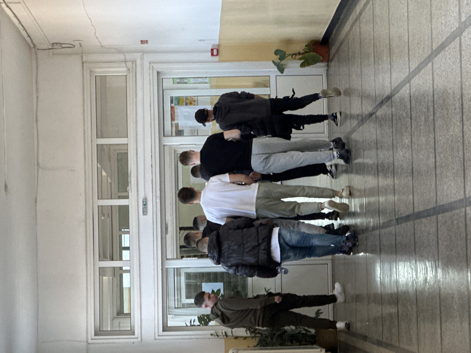 The scene depicts an interior hallway within a building in Ihtiman, Bulgaria. Approximately eight to ten young men, appearing to be teenagers or young adults, are observed walking away from the camera towards a large double doorway with glass panels and a transom window. The hallway features a light-colored, reflective tiled floor with dark grout lines, and cream-colored walls with a yellow-beige lower section. The individuals are dressed in casual clothing, including hoodies, t-shirts, sweatpants, jeans, and athletic shoes. One male on the far left, wearing an olive-green hoodie and pants, is partially turned towards the camera. Another male in the mid-left wears a black puffy jacket over a white t-shirt and blue jeans, holding a clear plastic water bottle. An individual on the far right is seen wearing a dark hoodie, dark pants, and a black baseball cap. Above the doorway, a green "EXIT" sign with an arrow is visible. A potted plant with large green leaves is situated on the left side of the hallway, near the doorway. On the right side, another potted plant rests against the wall, below a red rectangular fire alarm box. Cracks are present in the paint on the upper right wall and ceiling, and exposed cables run along the ceiling-wall junction in this area. Papers or notices are visible through the glass panels of the doorway on the right.