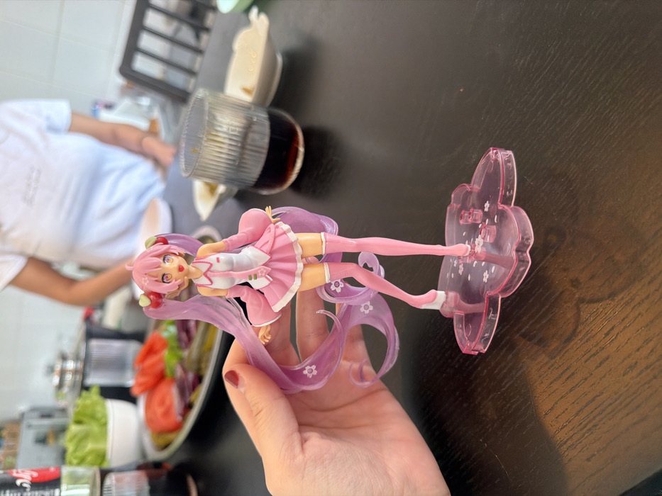 A human left hand, displaying short red painted fingernails, is prominently featured in the foreground, holding a pink anime-style figurine