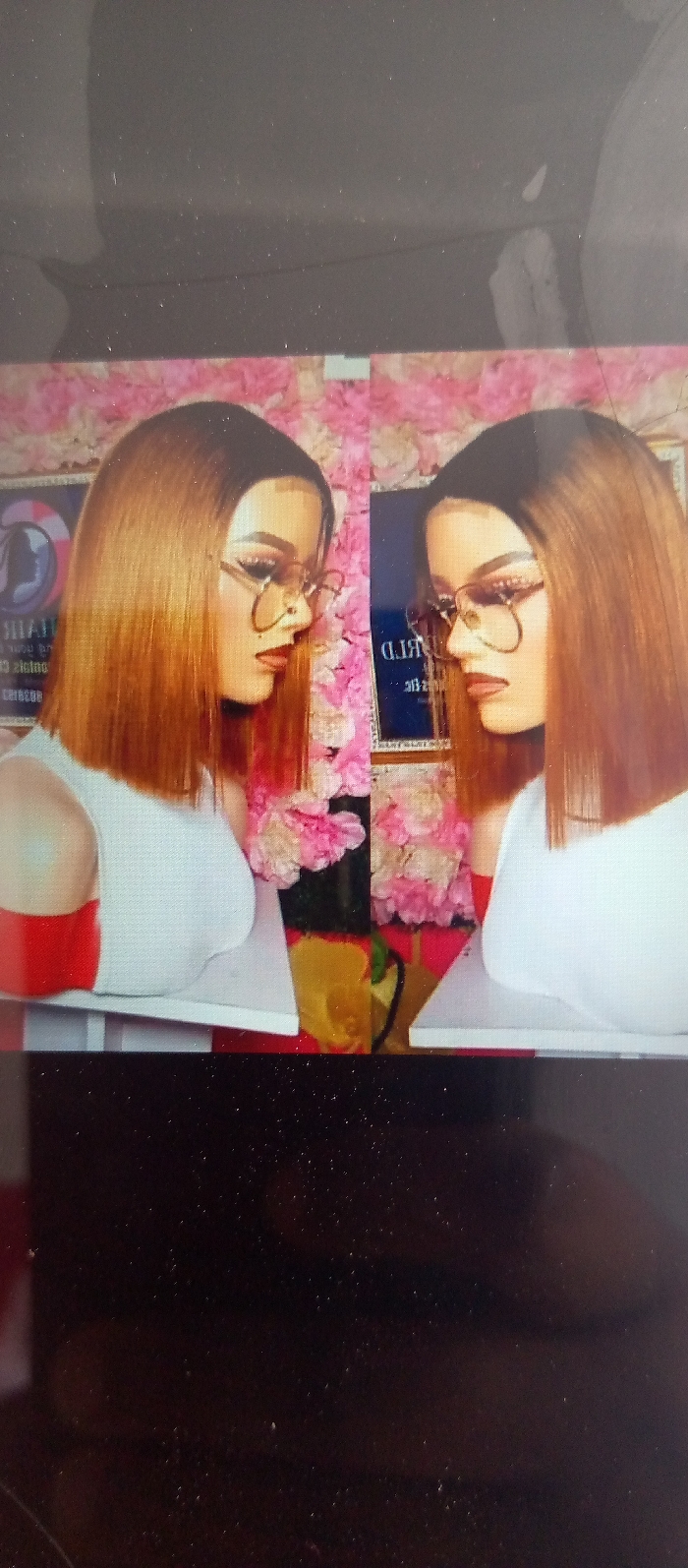 The image displays two identical female display mannequins from the mid-chest up, positioned in a three-quarter profile facing right, against a floral backdrop. The scene appears to be an interior display, possibly within a hair salon or retail store in Ukwu-Abwa, Nigeria. Each mannequin features light-toned skin, a straight, blunt-cut bob wig with an ombre color scheme transitioning from dark brown roots to reddish-blonde ends. They wear large, circular, thin-framed eyeglasses, detailed makeup including defined eyebrows, eyeshadow, eyeliner, and red lipstick, and a small nose piercing. Both are clad in plain white sleeveless tops. The background consists of a wall covered with clusters of pink and cream-colored artificial flowers. Partially visible behind the mannequins are dark blue rectangular signs with mirrored text, appearing to advertise "HAIR WORLD." The mannequins rest on a light-colored surface, beneath which the lower portion of the image is dark and speckled, suggesting a reflection on a screen.