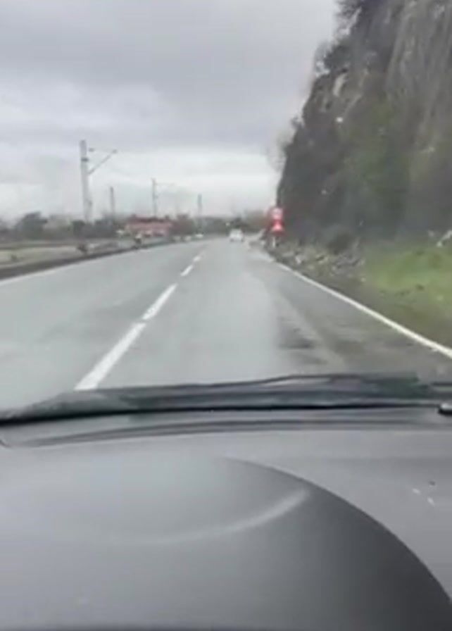 view from inside a car driving on a wet road. It's a cloudy day. A rocky hillside is visible to the right of the road, and power lines run along the left. Another vehicle is ahead on the road. The windshield wipers operate briefly.