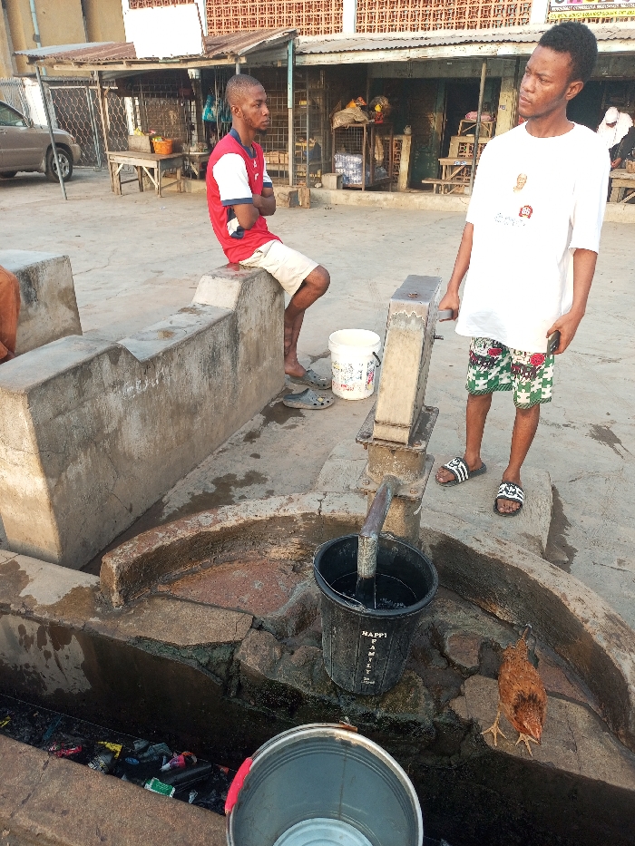 Two young men stand near a water pump outdoors. One sits on a low, concrete wall, dressed in a red and white shirt and tan shorts. The other stands near the pump, wearing a white t-shirt and patterned shorts. Buckets fill with water from the pump, one marked "Happy Family." A chicken stands nearby on the concrete. A gutter runs beneath the pump, containing trash. A car is parked in the background. Buildings are visible behind the figures.