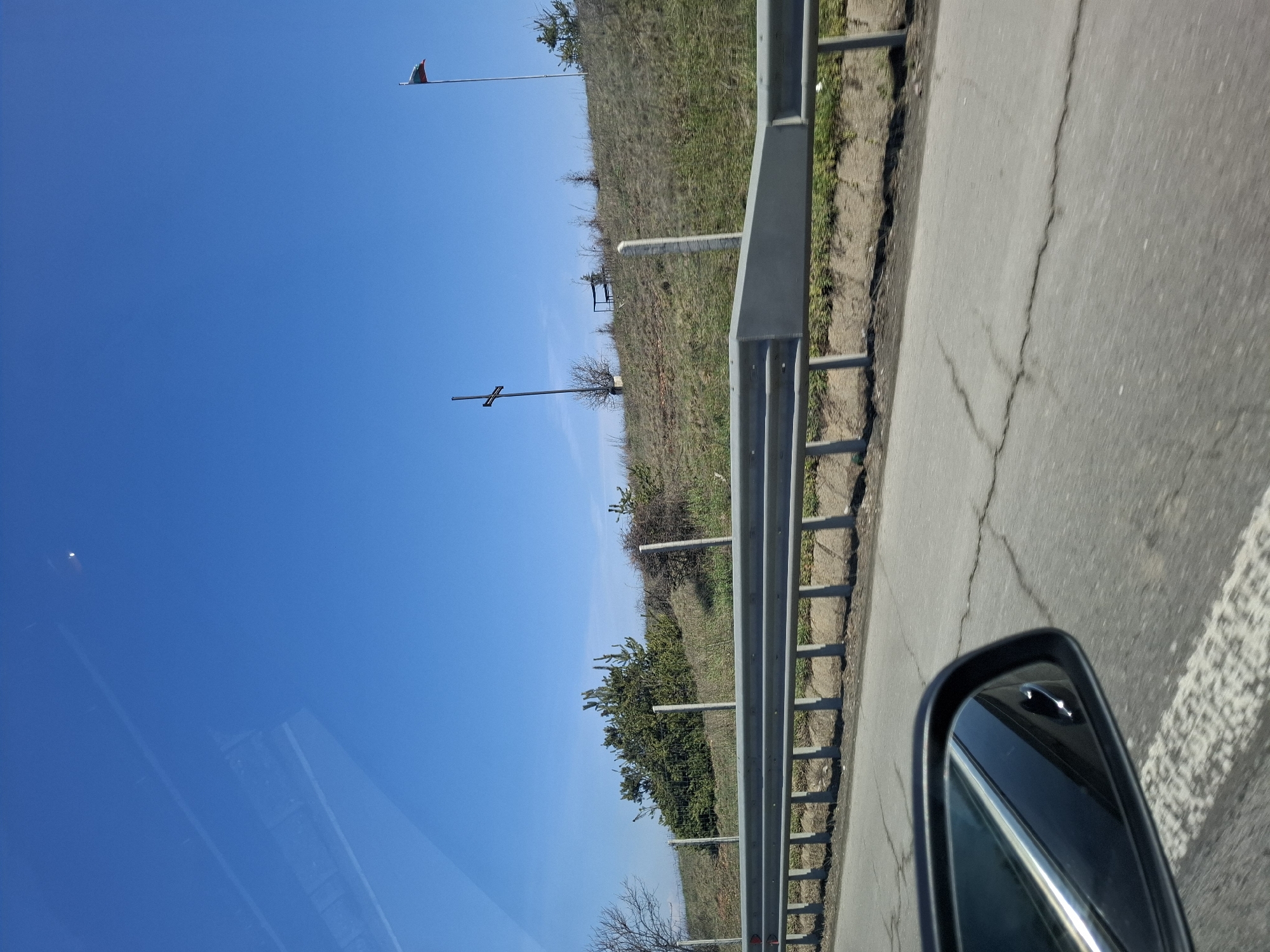 The image depicts a scene from what appears to be a car's perspective, traveling along a road in Vakarel, Bulgaria. The sky is clear and blue. A guardrail runs alongside the road, separating it from a grassy hillside. A Bulgarian flag is seen atop a pole, a cross is also visible further along the horizon. The car's side mirror is visible in the foreground. The road surface is cracked in places. The scene is taken during daytime.