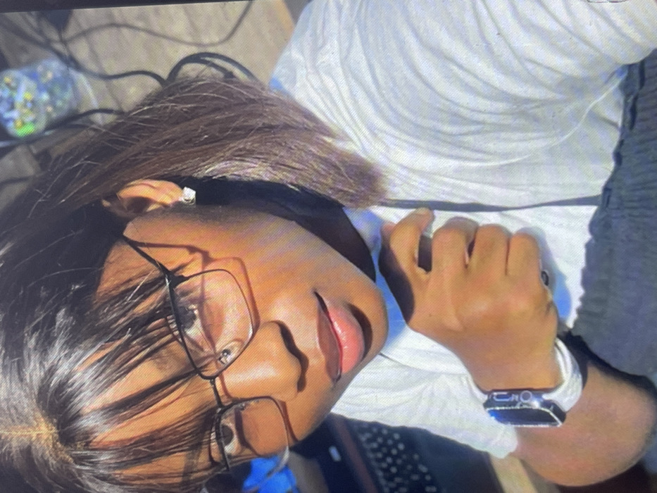 A young Black female individual is depicted from the upper torso upwards, posing for a photograph in what is indicated to be Samaru, Nigeria. She has dark, shoulder-length hair with bangs, and wears black-framed rectangular glasses. A light-colored stud earring is visible in her right ear. Her lips are slightly parted, showing a light pink hue. She is wearing a white short-sleeved top. On her left wrist, she wears a smartwatch with a white band, and a ring is present on her left ring finger. Her left hand is partially clenched and positioned near her upper chest. The background is out of focus and dark, revealing blurry blue and dark objects on the left, and a translucent container with colorful contents and black cables on the right.