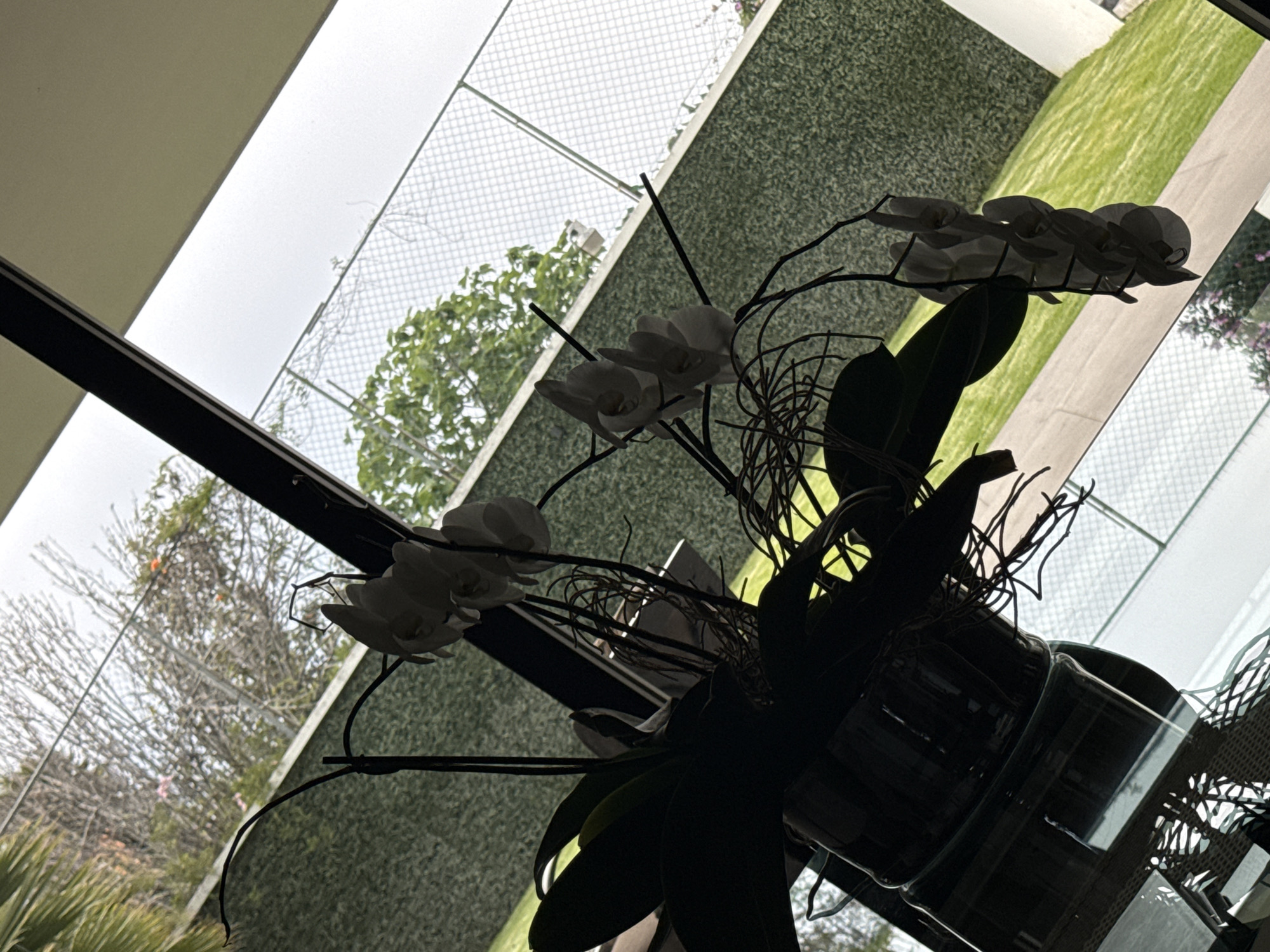 The photograph, likely taken indoors in San Bernardino Tlaxcalancingo, Mexico, presents a low-angle view through a window. A large potted orchid arrangement dominates the foreground, its white flowers and dark green leaves sharply contrasting with the bright daylight visible through the glass. The pot itself is a transparent glass container. The window offers a view of the outside environment, including trees, possibly grass, and what appears to be some type of fencing or netting. The overall scene is bathed in natural light, creating strong contrasts between light and shadow, emphasizing the shapes and textures of the plants and the surrounding environment.