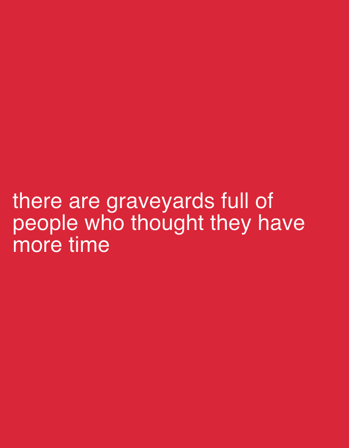A stark red background serves as the backdrop for a sobering message. White text reads: "there are graveyards full of people who thought they have more time." The words are centrally located, conveying a sense of urgency and reminding viewers of the preciousness of life. The simple design accentuates the profoundness of the message.