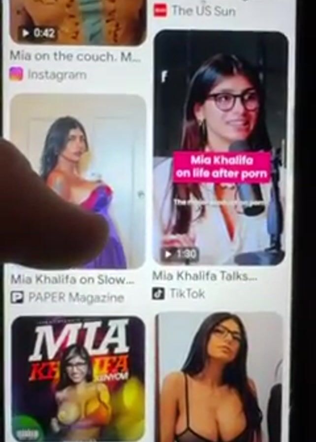 A finger on a person's hand scrolls down a Google search results page for Mia Khalifa