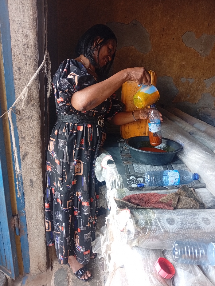 In Maiburiji, Nigeria, an adult female with dark skin and a short, dark bob haircut is depicted in a narrow, indoor setting, likely a small shop or stall. She wears a long, black dress with a multi-colored abstract pattern, a black belt, small gold hoop earrings, a thin gold necklace, and black slip-on sandals. Her right hand is actively pouring a vibrant yellow-orange liquid from a clear plastic jug into a clear plastic water bottle, which she supports with her left hand. The bottle already contains a smaller volume of reddish-orange liquid. Behind her stands a large, yellow plastic jerry can. To her right, on a surface covered with gray patterned material, a black plastic basin holds a dark reddish-brown viscous substance. Adjacent to the basin are various items, including rolls of light-colored material, some wrapped in plastic with white patterns, empty clear plastic water bottles, one with a red cap, and a folded piece of reddish-brown cloth. The immediate environment includes a weathered blue and gray wall on the left, secured with a white string, and a distressed, tan-brown wall with peeling plaster on the right. The floor is uneven.