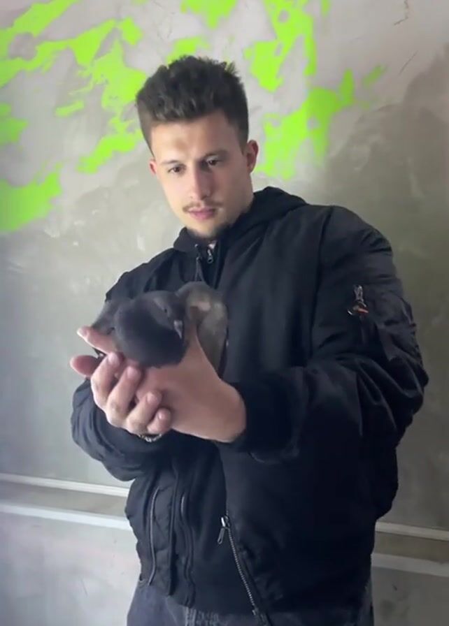 A young man is standing indoors, holding a grey pigeon in his cupped hands. He's wearing a black bomber jacket and dark jeans, and he looks directly at the camera, tilting his head slightly. He smiles at the end. Behind him is a textured wall, painted grey with streaks of neon green.