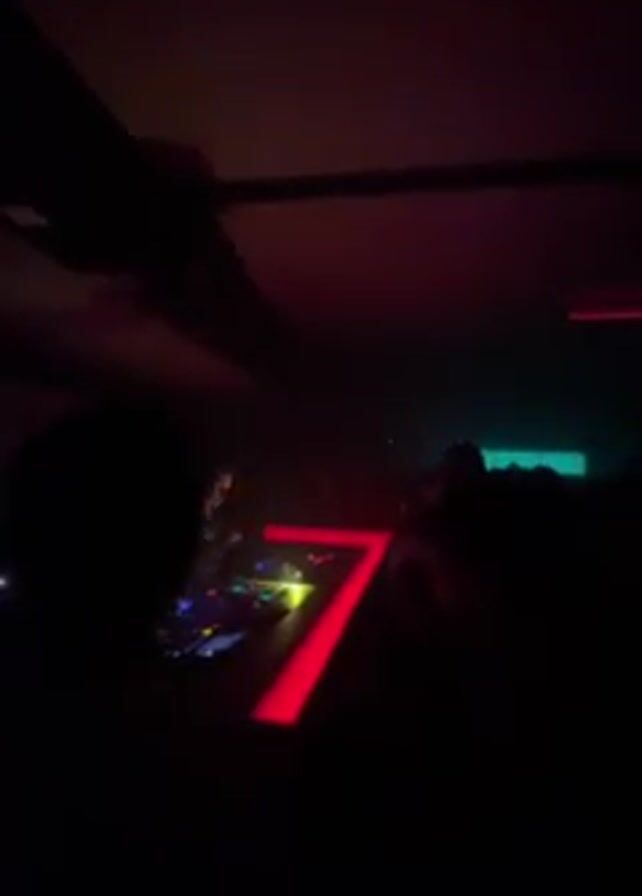 In a dimly lit nightclub, a DJ stands behind a console, set on a platform that displays a large, illuminated red number "7