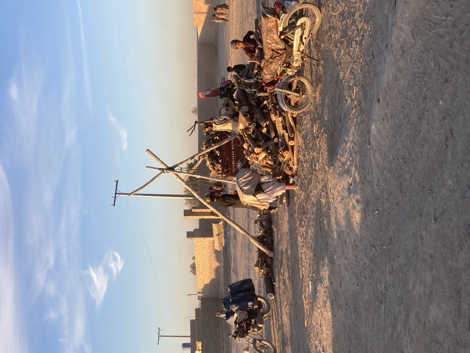 A rural scene unfolds with a focus on transportation and daily life. A parked motorcycle is loaded high with wood. Nearby, a truck bed is similarly filled, next to a makeshift tripod of sticks. Two people are observed, one seated and another standing, possibly in conversation. Further down the road, another motorcycle, laden with blue bags, is parked. In the background, a low brick wall stretches horizontally, against a light blue sky with some clouds.