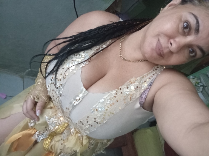 An adult female is depicted in a close-up, high-angle shot, looking directly at the camera with a slight smile. She has dark, braided hair visible over her left shoulder. She wears a light-colored, possibly off-white, top featuring extensive gold and silver sequin and lace embellishments around the neckline and bust. A light purple bra strap is visible under her right armpit. A thin gold chain necklace adorns her neck. Below the top, a gold-colored garment or skirt with similar gold sequin/lace details and a gold sash is visible. Her left hand is covered by a sheer, gold-colored lace glove or sleeve, with a ring on her ring finger and manicured nails with white tips. The background appears to be an indoor setting, with a plain, light grey wall in the upper left, a dark cable or wire at the top left, and obscured furniture or objects, including a green cushion or fabric, in the mid-right and lower right. The scene is located in the city of Unknown, Unknown.