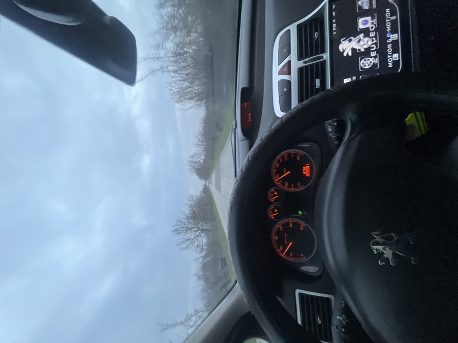 The image displays a forensic view from the interior of a moving vehicle, a Peugeot, looking out through the windshield onto a rural road in the vicinity of Topolovgrad, Bulgaria. In the foreground, the black steering wheel with a central Peugeot logo is prominent, fitted with a dark, possibly braided, cover on its rim. The instrument cluster behind the wheel is illuminated, indicating approximately 80 km/h on the speedometer and 2,000-2,500 RPM on the tachometer. A digital readout below the speedometer displays "15 768" and "38930 I", with a green indicator light active on the dashboard. To the right of the steering wheel, a segment of the dashboard is visible, featuring silver-trimmed air vents, various control buttons including a hazard light switch, and an infotainment screen showing the Peugeot logo, "MOTION & P_MOTION" text, and the time "17:55". The exterior scene reveals a straight, two-lane asphalt road receding into the distance. Both sides of the road are lined with dense, bare deciduous trees and brush, suggesting a late autumn or winter environmental condition. The sky is entirely overcast, presenting a uniform grey cloud cover. A dark, indistinct object, potentially a small vehicle or debris, is partially visible on the left shoulder of the road in the mid-distance. No individuals are discernible in the scene.