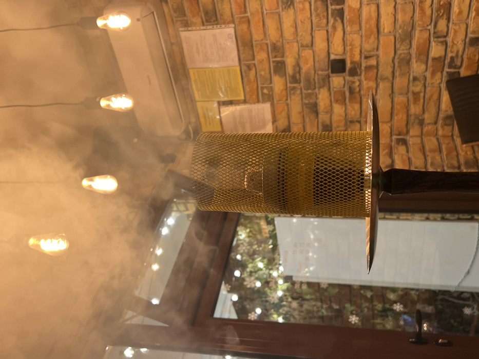 room with exposed brick walls, papers, and a white air conditioner. A decorative light fixture with a gold mesh shade and a sharp, sword-like blade extends from the center. The room appears hazy with lighting resembling exposed bulbs. A window with frosted decorations is visible beneath the light fixture.
