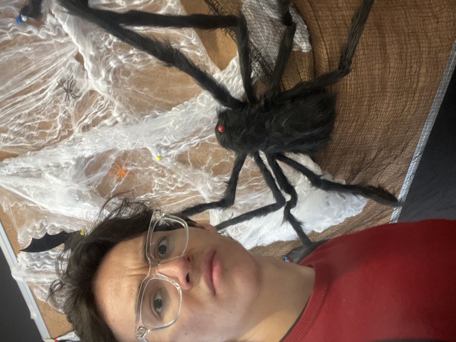 The image displays a young adult individual in a close-up, selfie-style photograph taken indoors. The individual, positioned on the left, possesses dark, disheveled hair and wears clear-framed eyeglasses, a red long-sleeved top, and a black undershirt visible at the collar. Their facial expression is characterized by furrowed brows, a slightly open mouth, and a direct, wide-eyed gaze towards the camera. The background is an interior wall or partition decorated with Halloween-themed items. A large, black, plush spider with prominent red eyes and eight segmented legs is centrally located on the right side of the frame. White artificial cobwebs are draped across the background, covering a brown, textured surface, possibly fabric or paper, which is secured with various colored thumbtacks (yellow, blue, white). Smaller plastic spiders, including an orange one and a black one, are visible on the cobwebs. A black bat silhouette is partially visible in the upper left behind the individual's head. The brown decorated surface meets a thin silver strip, below which is a black surface. The specific location within the city of Roubaix, France, cannot be determined from the visual information presented in the image.
