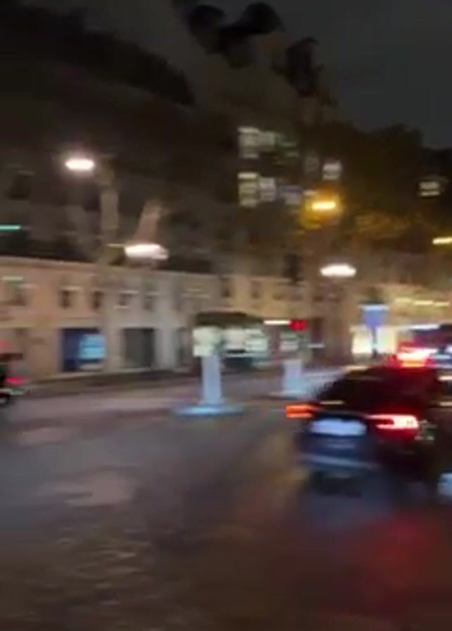 night scene in a European city, likely Paris. The street is wet, reflecting light from streetlamps and car headlights. Several cars are driving through an intersection, and pedestrians are visible on the sidewalks and crosswalks. Buildings line the street, with architectural details like columns and mansard roofs. Trees are present along the street, with some leaves visible under the streetlights. The overall atmosphere is urban and illuminated.