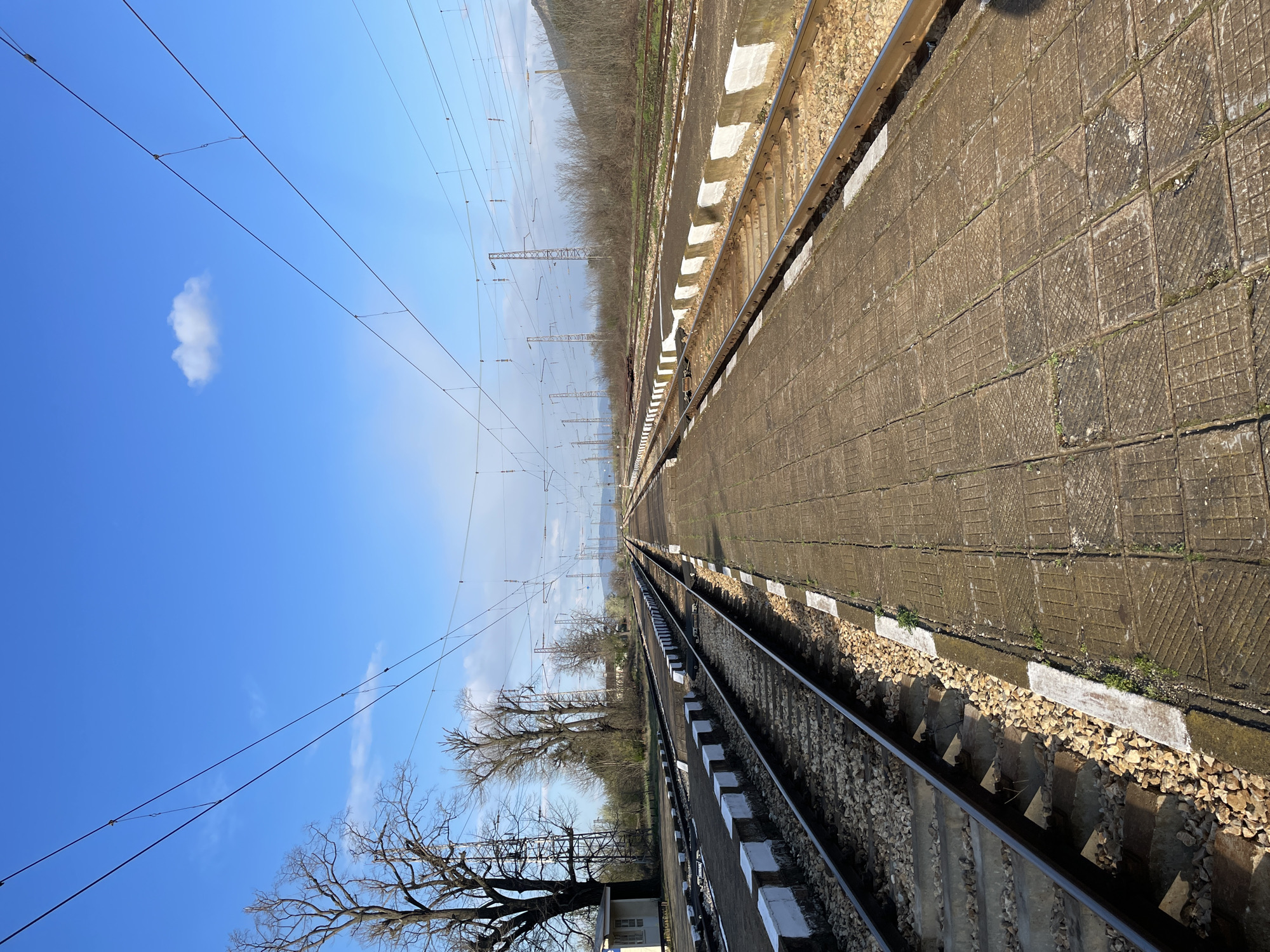 The image depicts a train track in Dabovo, Bulgaria. The tracks extend into the distance, flanked on either side by concrete slabs and gravel. Power lines are visible overhead, crossing the blue sky with a single cloud. Trees line the left side of the tracks.