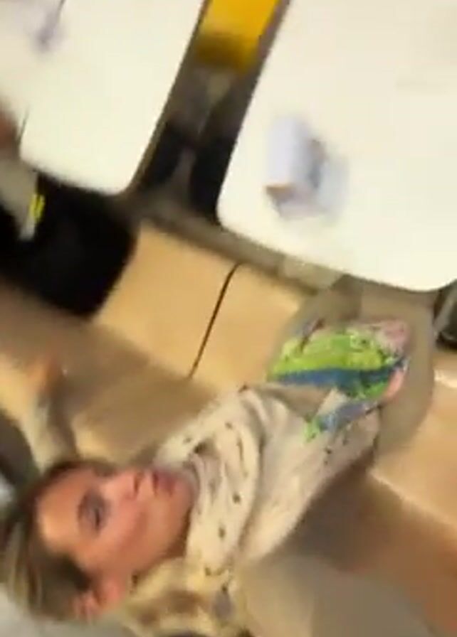 A person is videoing while reclining on a bench in a food court, possibly at an airport. The area has numerous tables and chairs, and other people are present. The food court appears to have a McDonald's restaurant. The videographer pans the camera, showing different areas of the food court and various individuals at tables.