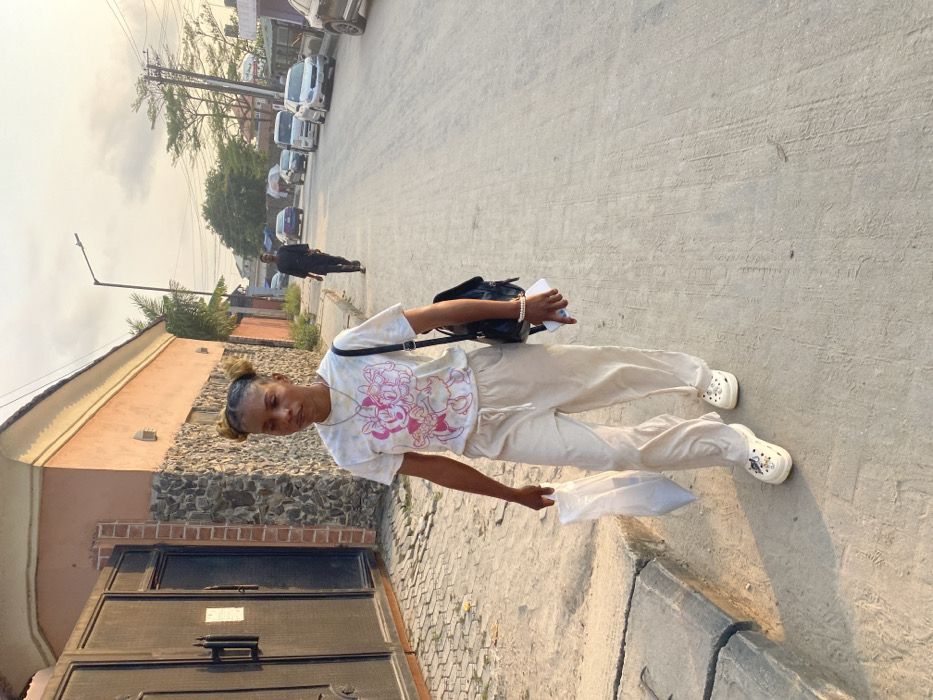 A young woman stands in the street wearing light-colored pants, a t-shirt with pink graphics, and white clogs