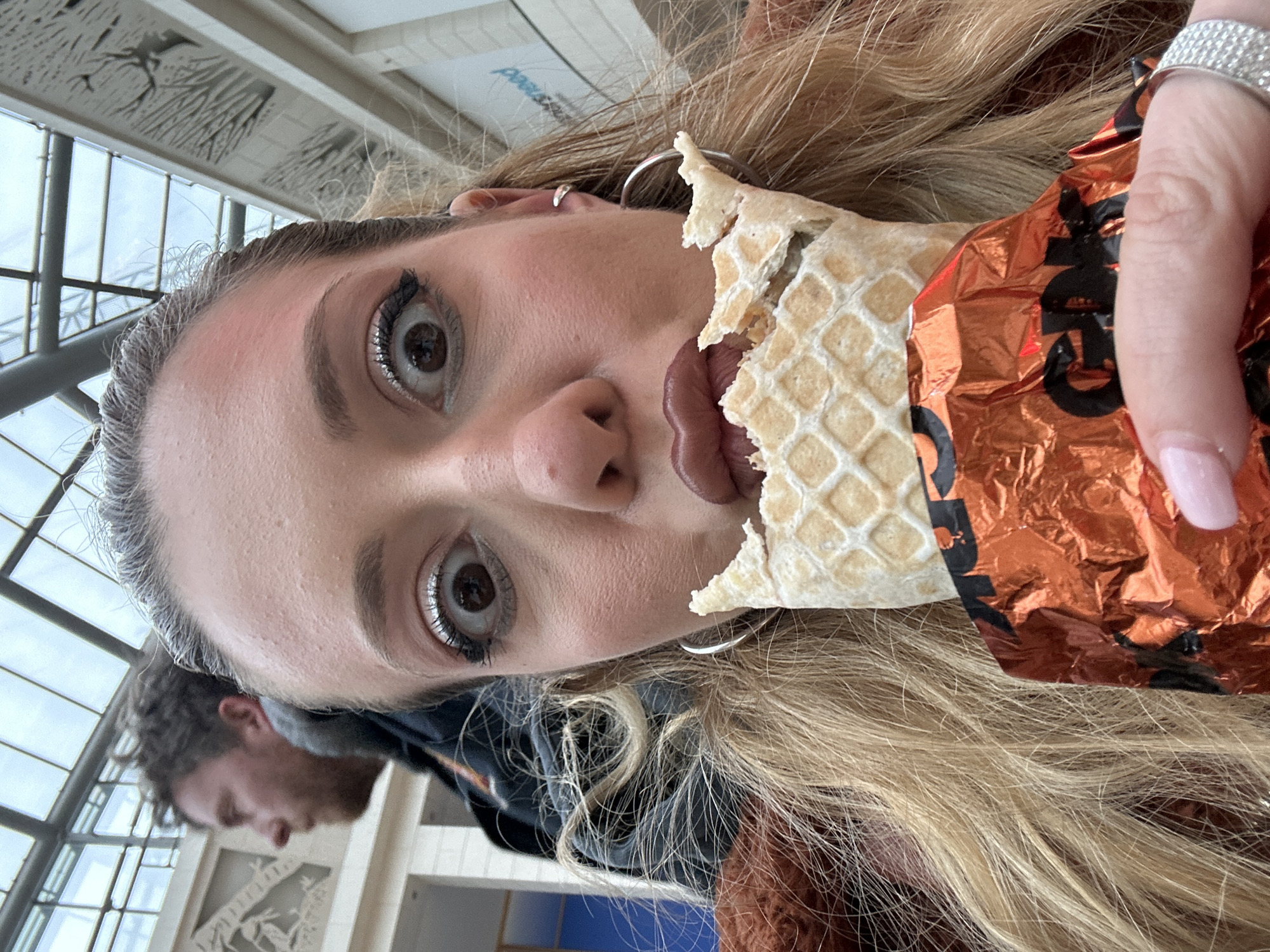 A woman is eating what appears to be a Taco Bell Choco-dilla, based on the orange foil wrapper with black lettering. She is holding it in her right hand, which has a sparkling ring and a nail with light pink polish. The woman has light blonde hair, silver hoop earrings in both ears, and noticeable makeup, particularly around the eyes. To the left of the frame, partially visible, is a man with short, dark hair and a beard. The background includes a window and architectural details suggesting an interior public space in London, United Kingdom.