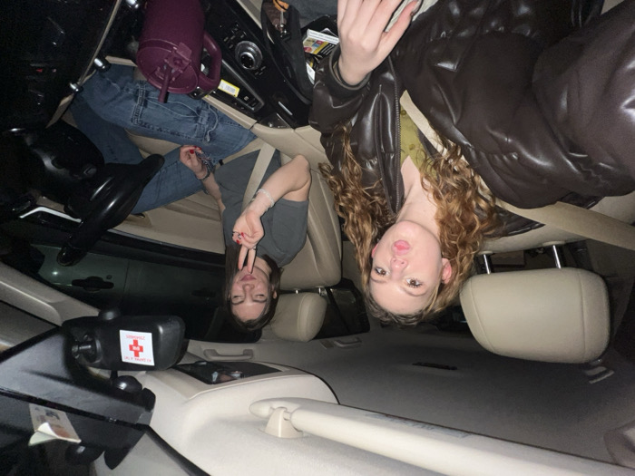 The scene depicts the interior of a vehicle, likely stationary, during nighttime or in a dimly lit environment. No specific external geographical markers for Samokov, Bulgaria, are visible within the frame. Two females are present. A female subject occupies the front passenger seat, wearing a dark grey short-sleeved top, blue jeans, and light-colored bracelets on her left wrist. She has medium-length dark hair, her eyes are closed or squinted, and her right hand is raised, displaying a peace sign with red nail polish visible on her fingers. A seatbelt diagonally crosses her torso. In the immediate foreground, likely taken from a rear passenger seat perspective, a second female subject is visible. She has long, curly reddish-brown hair and is wearing a dark brown puffer jacket over a green garment. Her lips are puckered in a pouting expression, and a seatbelt is visible across her chest. The vehicle's interior features beige leather seats and a dark dashboard. A rearview mirror is visible, bearing a white sticker with a red cross and partially discernible text. On the center console or dashboard area, a large, dark purple travel mug with a straw is present, alongside what appears to be a package of cigarettes or vape cartridges. The overall lighting suggests artificial interior light sources, contrasting with the dark exterior visible through the windows.