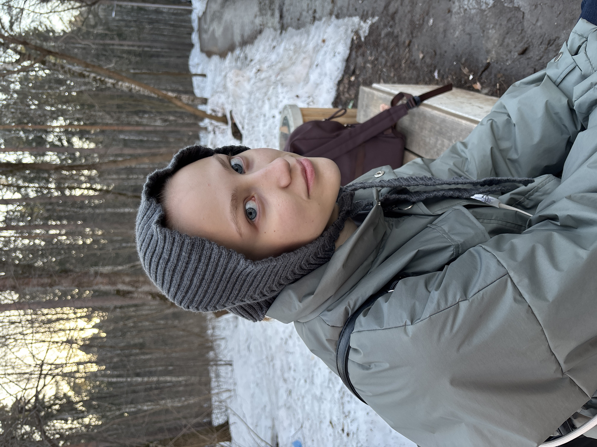 A person, possibly female, sits on a wooden bench outdoors. The individual has light skin, blue eyes, and is wearing a gray knitted hood and a gray jacket. A brown backpack rests on the bench beside her. In the background, there is a snowy landscape with trees and patches of remaining snow on the ground. The location is potentially in Perm, Russia, based on the landscape characteristics.