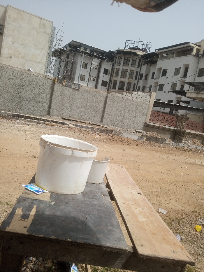 The image displays an outdoor scene in Bwari, Nigeria, characterized by construction activity. In the foreground, a makeshift wooden surface, composed of a dark, worn board and a lighter wooden plank, supports two white plastic buckets: one large, and one smaller and partially obscured. A blue and white wrapper lies on the dark board near the larger bucket. The immediate ground is unpaved, consisting of reddish-brown dirt with scattered debris. A textured concrete perimeter wall runs horizontally across the midground. Behind this wall, several multi-story buildings are visible. The central building is light-colored with numerous windows and balconies, and scaffolding is present on its left side, indicating ongoing construction or renovation. An unfinished concrete structure is visible to the far left, and another white-faced building appears on the right. The sky is bright and hazy. No individuals are present in the frame.