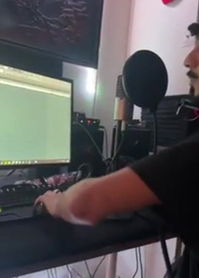 A person wearing a black t-shirt and black beanie sits at a desk in front of a computer. The person has dark hair and a mustache and beard. The person is looking at the computer screen and moving the mouse with their right hand. The person’s left hand is on the keyboard. On the desk are a microphone, a pop filter, and other electronic equipment. On the wall behind the person is a painting and a red hat. The computer screen shows a music production program.