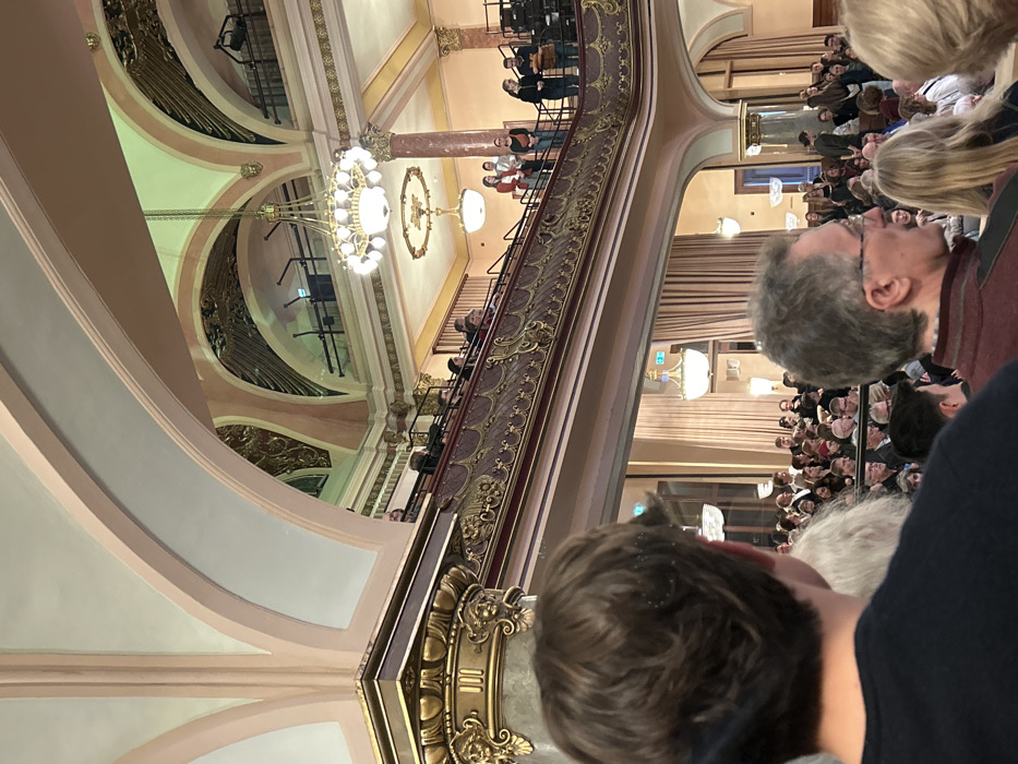 The image displays the interior of a grand hall, identified as the Stadthalle Heidelberg in Heidelberg, Germany, depicting a large audience gathered for an event. The environment features high, arched ceilings painted in light peach and off-white tones, adorned with extensive gold decorative elements and friezes. Multiple opulent chandeliers, including a prominent multi-tiered fixture, provide illumination. Two levels of ornate balconies are visible, each with dark red and gold railings featuring intricate scrollwork. The lower balcony has tiered seating occupied by attendees. The upper balcony also hosts individuals, some seated and a group of approximately five standing on the far right. In the foreground, the back of a person's head with brown hair is visible on the left, while the side profile of an adult male with gray hair and glasses is seen on the right. Below the balconies, numerous rows of seats are filled with a diverse crowd of adults, all generally facing forward towards an unseen focal point. Ornate columns with gold capitals, some featuring relief sculptures of faces, support the architectural structure. Elements resembling stage lighting or technical equipment are mounted on scaffolding in the upper reaches of the hall. People are primarily observing the scene, with no explicit interactions discernible among the visible audience members.