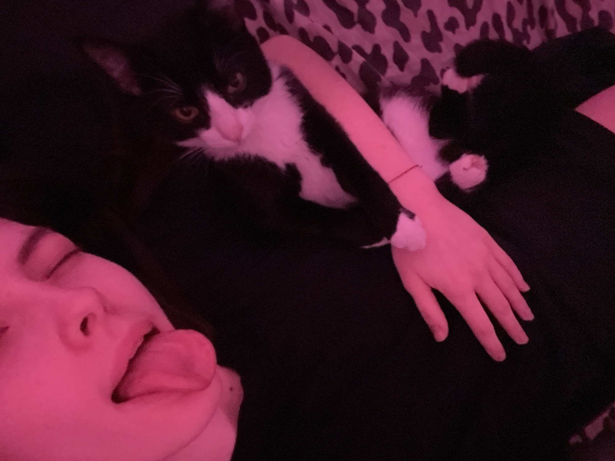 An indoor scene is depicted under a strong, pervasive reddish-pink illumination. In the upper left quadrant, the partial face of an individual is visible, characterized by closed eyes and an extended tongue. The individual wears a dark garment. To the right and below, a black and white tuxedo cat rests, its head turned towards the viewer, displaying distinct yellow-green eyes. The individual's bare right forearm and hand extend towards the cat, with a thin red string or band visible on the wrist. One of the cat's white paws is positioned on the individual's hand, indicating physical contact. To the right of the cat, a patterned fabric, appearing to be an animal print (e.g., leopard or cow print), serves as background material. The remainder of the background is obscured by darkness. The indoor setting offers no discernible landmarks or features to identify its location within Saint Petersburg, Russia.