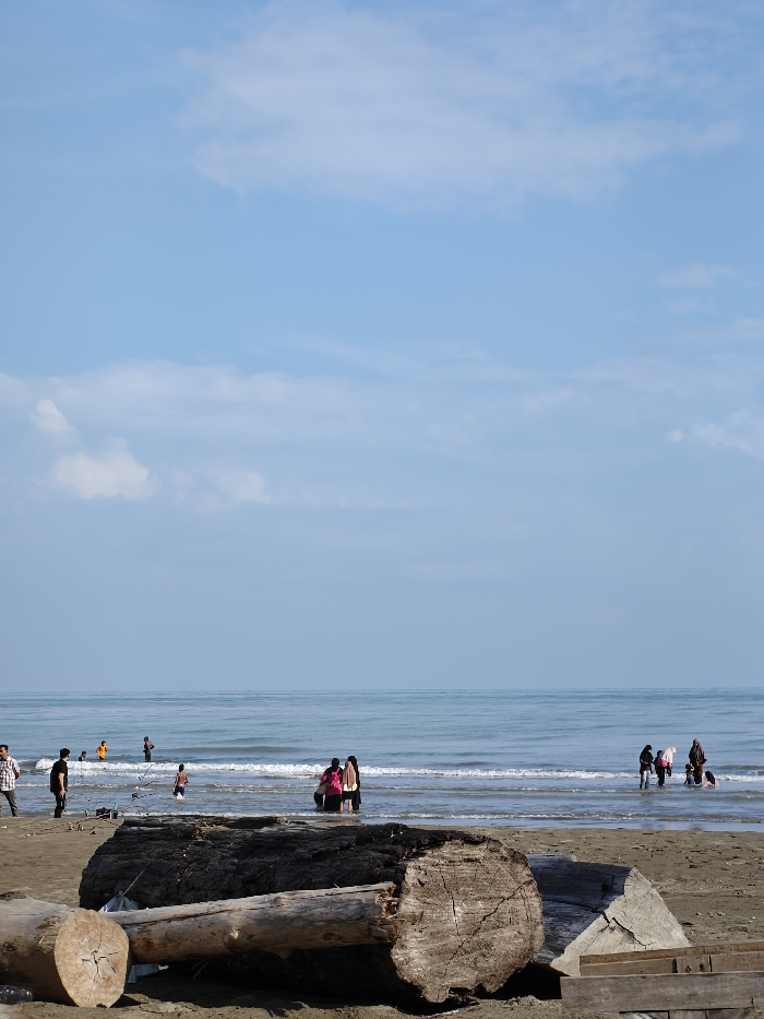 This image depicts a daytime scene on a sandy beach in Reudeuep, Indonesia, under a clear light blue sky with scattered white clouds. The calm ocean extends to the horizon, featuring small waves breaking near the shore. In the foreground, three large, dark brown, weathered tree logs lie on the dark sand. A prominent log runs horizontally across the lower center, displaying cut ends and textured bark. Another smaller log is partially obscured behind it, and a triangular section of wood is visible to the lower right, alongside some lighter debris and a partial wooden plank structure. Approximately ten individuals are visible along the waterline. On the left side, two individuals stand on the wet sand, facing the water. Further out, four people are wading or swimming in the shallow ocean; one in a yellow shirt, two in dark shirts, and a smaller individual (possibly a child) appears to be holding a fishing pole or stick in the water, near what resembles fishing nets or lines. On the right side of the frame, a group of approximately five individuals, including women wearing hijabs and long clothing, are gathered in the shallow water, appearing to interact socially. One person is wearing a pink top, and another a light-colored hijab. The overall scene suggests recreational beach activity.
