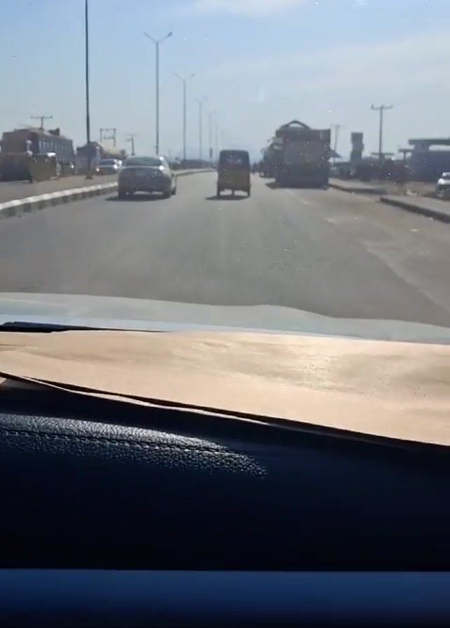 The view from inside a car driving on a multi-lane highway on a sunny day. The camera faces forward, capturing a road with a car, a tuk-tuk, and several large trucks ahead. Streetlights line the side of the road. The dashboard is visible in the foreground, with a tan paper on top. The sky is blue with the sun shining bright.