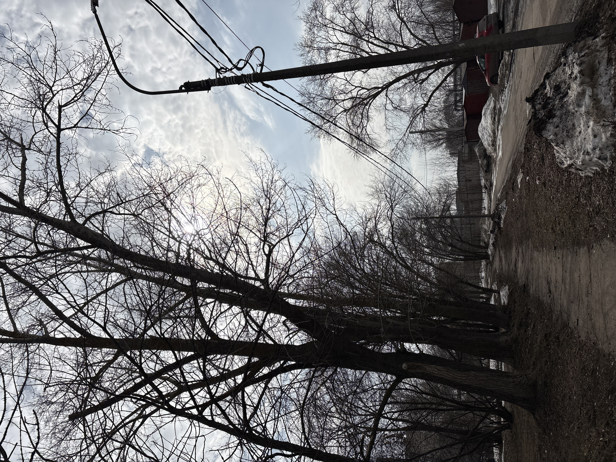 street scene in Ulyanovsk, Russia, during what appears to be late winter or early spring. A row of leafless trees lines the left side of the street, with their branches creating a dense network against the sky. Overhead, power lines and utility poles are visible. The ground is covered with patches of snow and dirt. On the right side of the street, a concrete fence and some parked cars are visible. The sky is overcast with thin, streaky clouds. There is no evidence of people.