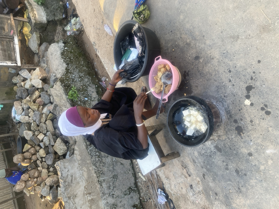 The image depicts an outdoor scene in Idon Kasa, Nigeria, focusing on a woman engaged in food preparation