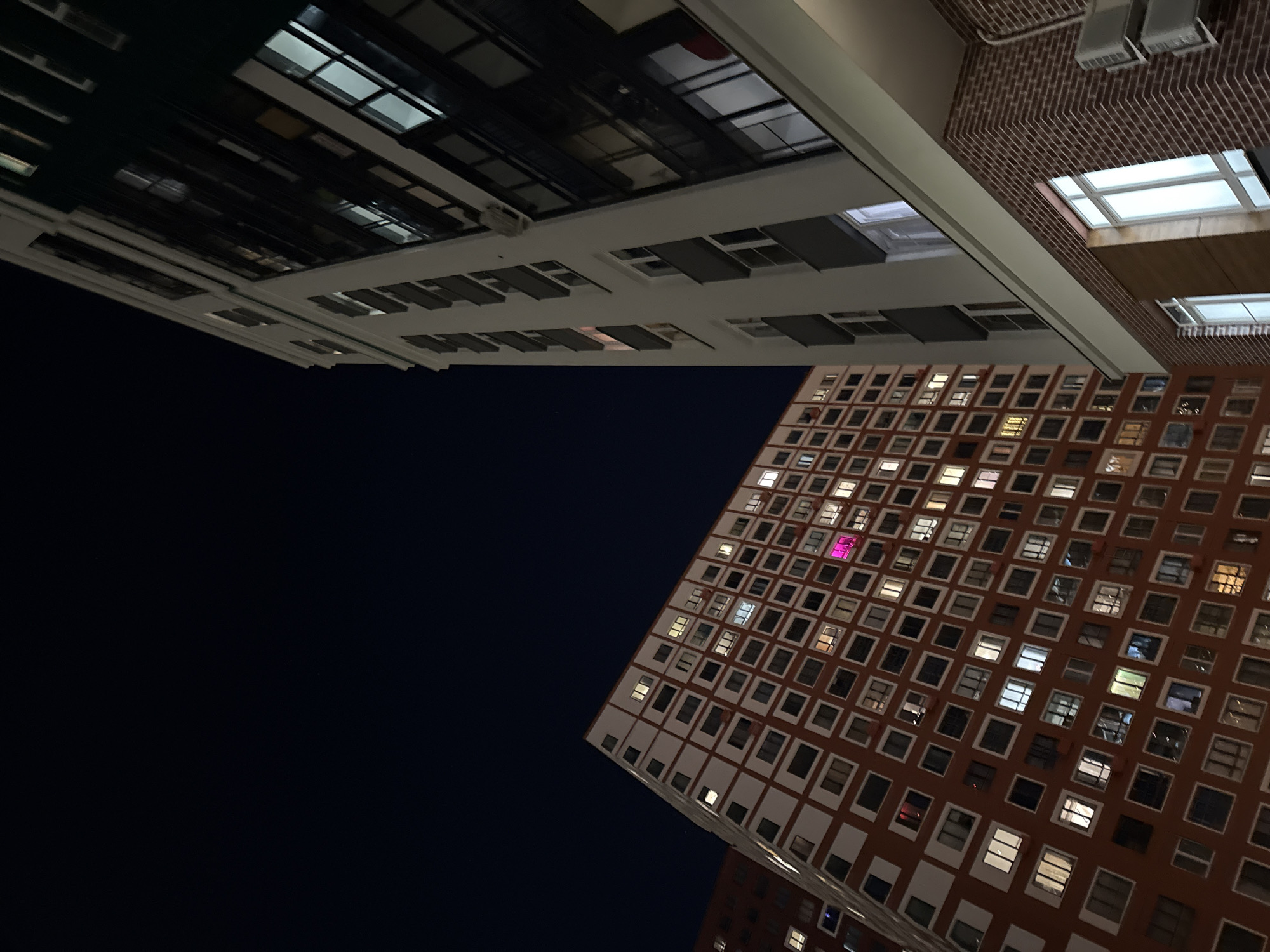 low-angle view of buildings at night. On the right, a reddish-brown building with a grid pattern of windows is visible. Many windows are illuminated. One window emits a magenta light. Above and partially obscuring the building on the right, are the underside of two other buildings. One is a white building with window modules. The other has an alternating pattern of brick and white windows. The background is a dark, almost black, night sky. The exact location in Yekaterinburg, Russia, cannot be determined from the image alone.