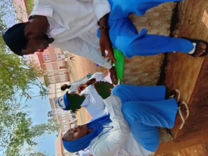 Several people sit outside, wearing school uniforms consisting of white tops and blue trousers or hijabs. One person wears sandals. A building stands in the background with multiple windows. Some green fabric is also present. The image is slightly blurry.