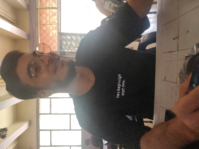 young adult male, positioned slightly off-center to the right, seated indoors at a table in Ash-Shaghour Municipality, Syria. He is depicted from the chest up, with short dark hair, a light beard, and round, thin-framed glasses featuring light orange tinted lenses. He is smiling, revealing dental braces on his upper teeth. He wears a black short-sleeved t-shirt with the white text "new beginnings start now." visible on the left chest area. His right forearm and hand are in the lower foreground, resting on a light-colored tiled table, with his hand appearing to interact with a dark object, possibly a smartphone or computer mouse, partially covered in silver foil or tape. The background consists of large, multi-paned windows admitting bright natural light. The indoor environment features light-colored ceiling beams with subtle purple or lavender accents, and a partially visible decorative light fixture hangs from the ceiling in the upper left. Black chairs are visible in the background and midground, along with blurred figures suggesting other individuals within the space.