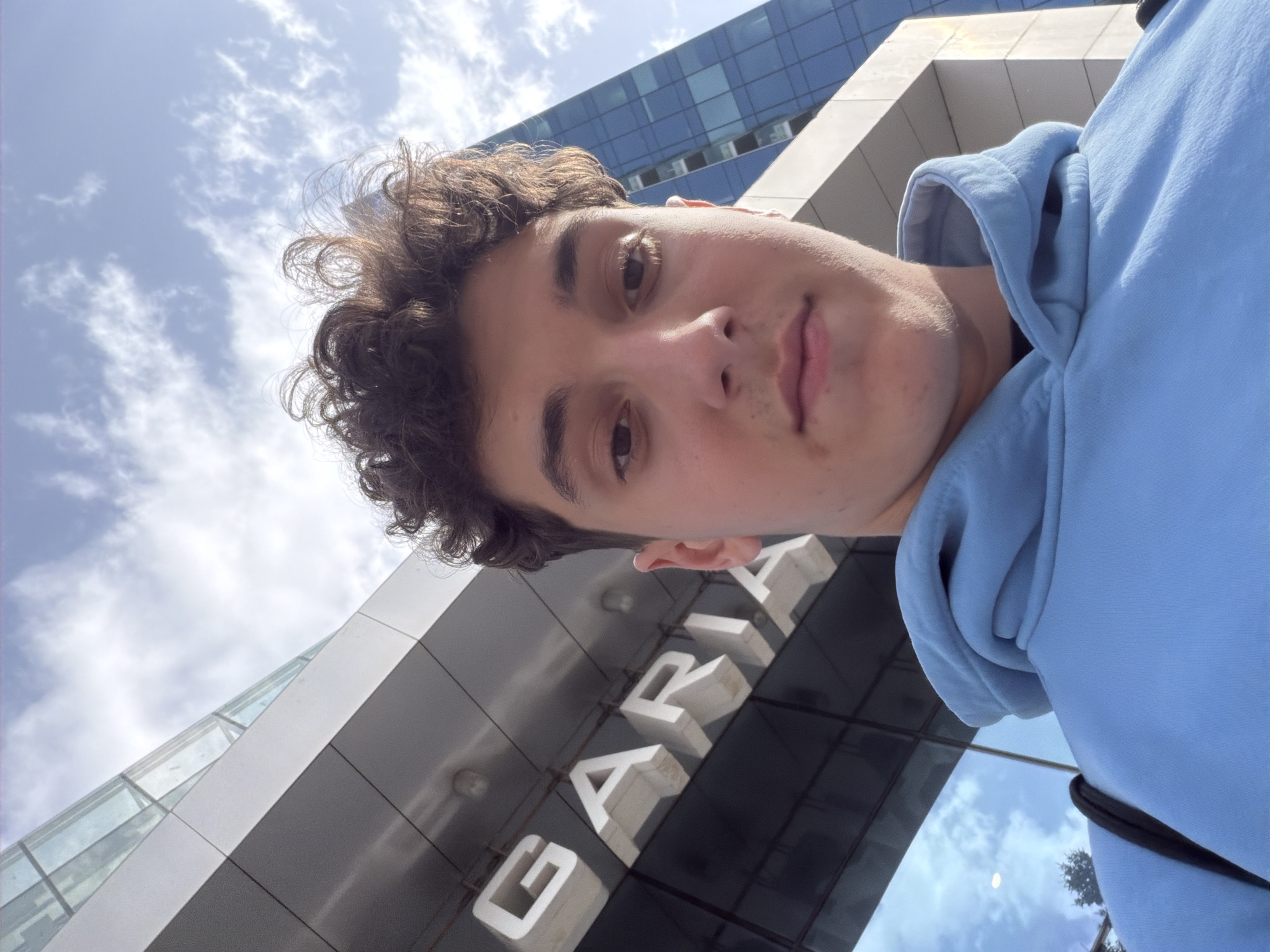 A young man is taking a selfie outdoors with a building in the background. He has curly brown hair and is wearing a light blue hooded sweatshirt. The building behind him appears modern with glass and metal architecture. The name "GARIA" is prominently displayed on the building in large, white block letters. The sky is visible with scattered clouds. The location is Sofia, Bulgaria, based on the name "GARIA" appearing on the building.