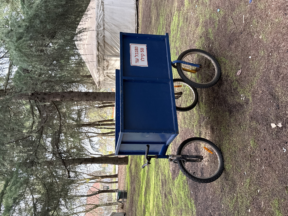 A blue cargo tricycle stands outdoors on a grassy area with trees and a white tent visible in the background. The tricycle has a deep blue cargo box with a sign in Hebrew script and the number "50". It features one front wheel and two rear wheels. The ground is a mix of grass, dirt, and some fallen leaves.