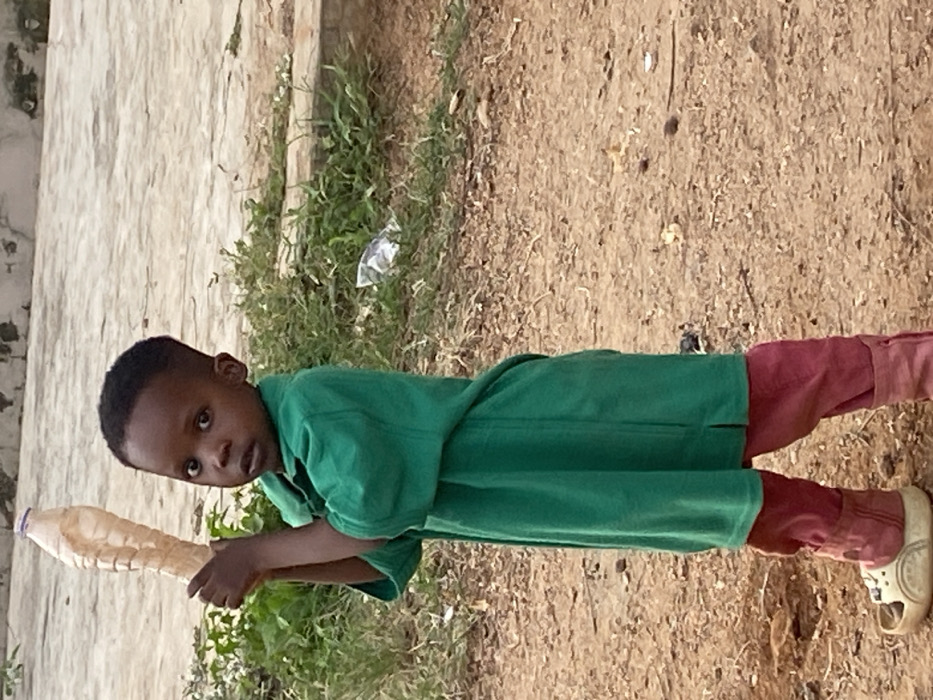 A young, dark-skinned child stands in an outdoor, unpaved area in Adankolo, Nigeria