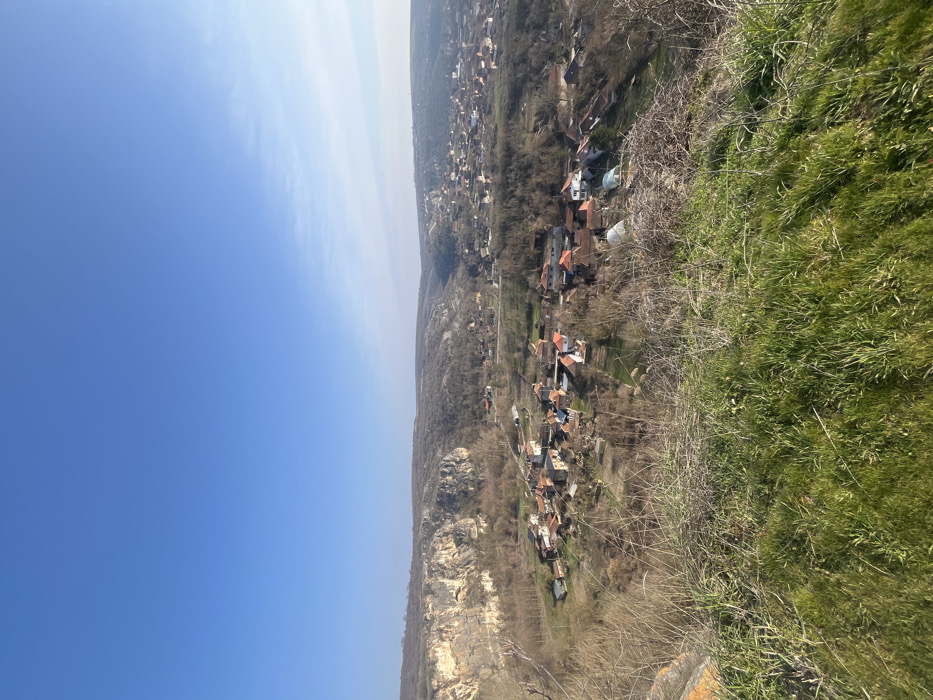 The image presents an elevated panoramic view overlooking a valley in Cherven, Bulgaria