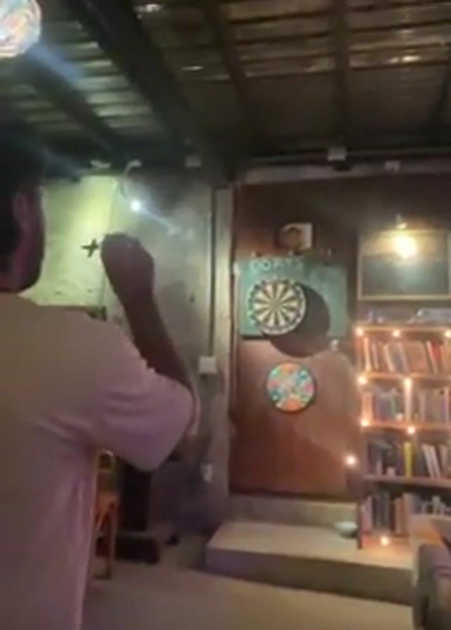 A man is playing darts in an indoor space. The darts board is fixed to a brown door, with a green chalkboard above it reading “DORTS” in white. Another decorative circle is below the dartboard. To the right of the door is a bookshelf filled with books and illuminated by fairy lights. The man throws a dart, which hits the dartboard. The room has a rustic feel with a wooden ceiling, visible pipes, and concrete walls.