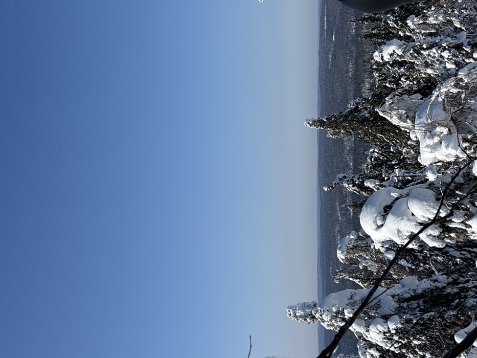 The image displays a panoramic winter landscape located in Shumikhinskii, Russia. The upper two-thirds of the frame are occupied by a clear, bright blue sky, devoid of clouds. The lower third presents a vast, dense coniferous forest, entirely covered in white snow, extending from the immediate foreground to the distant horizon. In the extreme foreground, dark, bare tree branches are partially visible, crossing the lower left and center. Individual evergreen trees throughout the mid-ground exhibit significant snow accumulation on their branches, appearing as rounded or conical snow masses. The terrain visible in the background suggests rolling hills or mountainous topography. No human figures, animals, or man-made structures are present within the scene. The environment is brightly illuminated by direct sunlight.