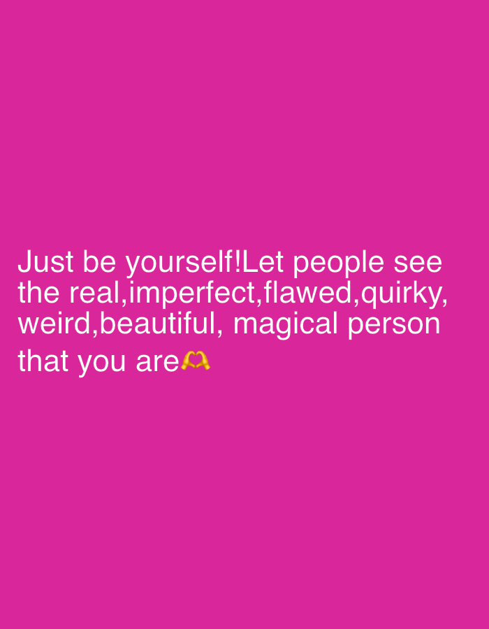 The image features white text on a solid magenta background. The text reads: "Just be yourself! Let people see the real, imperfect, flawed, quirky, weird, beautiful, magical person that you are." There is a small golden-yellow emoji of two hands making a heart shape after the word "are." The image does not depict any location or specific environment and is a motivational quote.