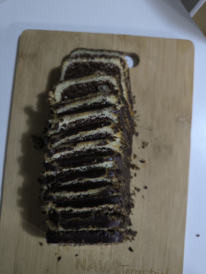 A stacked, sliced cake with alternating layers of light and dark batter sits on a wooden cutting board. The cake appears to be coated in a glossy, dark icing that adheres to the cut edges. Crumbs are scattered around the base of the cake on the board. The cutting board has a hole at the top and branding at the bottom that says "NAVA Terrestrial".