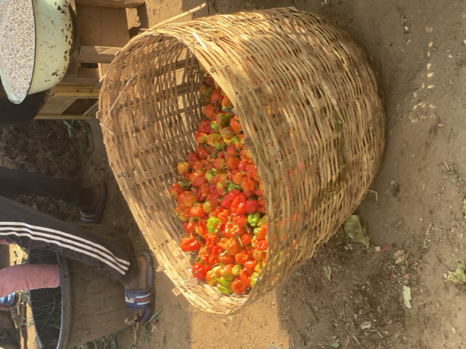 The image depicts an outdoor market scene in Kafanchan B, Nigeria. In the foreground, a large, light brown woven basket, approximately half-filled with numerous red, orange, and green bell peppers or similar chili peppers, rests directly on uneven, reddish-brown dirt ground. To the left and slightly behind the basket, the lower legs and feet of two individuals are visible. One person wears dark blue track pants with three white stripes down the side and blue slide sandals. Their feet are positioned near a large, dark gray or black plastic bucket containing green leafy produce, possibly onions or scallions. A second person, wearing light pink pants, has their leg partially visible within this same black bucket. Further in the background, to the right, a light green enamel bowl with white speckled paint, filled with white granular material (likely grains such as rice or beans), sits atop a small, light brown wooden stool or crate. The ground around the basket shows scattered bits of organic debris.