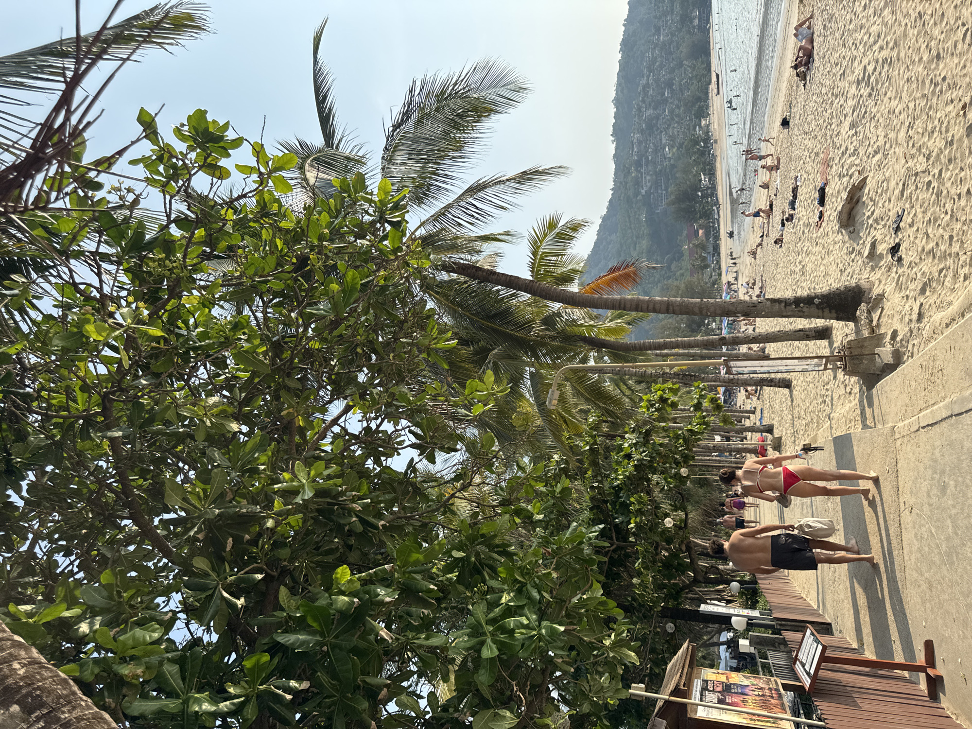 The image depicts a vibrant daytime scene at Kamala Beach in Kamala, Thailand, characterized by a bustling promenade and a sandy beach. In the foreground, a concrete promenade runs parallel to the coastline, shaded by a dense canopy of lush green foliage from large trees and numerous tall palm trees. On the left, a wooden stand displays posters, one advertising "Acoustic Night," with another wooden menu stand below it. White spherical lanterns are strung overhead between trees. On the promenade, a man with dark shorts and a woman in a red two-piece swimsuit walk away from the viewer; the man carries a light-colored bag, and the woman holds a small black object resembling a camera or phone. Other indistinct figures are visible further along the path. To the right of the promenade, a wide, light-colored sandy beach extends towards the calm, light blue ocean. Numerous individuals are scattered across the sand, some lying on towels sunbathing, while others stand or walk closer to the water's edge. Several people are wading or swimming in the shallow ocean waters. In the mid-ground, a traditional longtail boat is visible on the water. The background features a range of green, forested hills dotted with various structures, extending across the bay under a clear, bright blue sky. The overall scene conveys an active tropical beach environment.