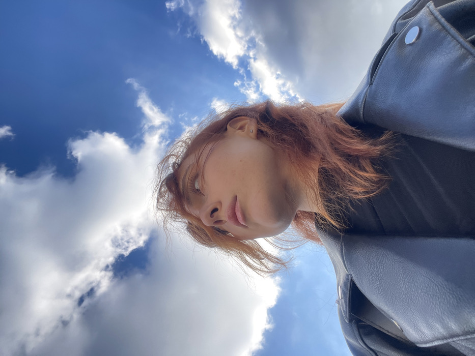 The image depicts a young individual, likely female, captured from a low-angle perspective against a bright blue sky filled with scattered white cumulus clouds. The subject has reddish-brown, shoulder-length hair, which appears wind-blown. They are looking upwards and slightly to the viewer's right. The individual wears a black leather jacket over a dark, possibly ribbed, garment. A small, light-colored stud earring is visible in the right earlobe. The scene is illuminated by natural daylight. No ground features or specific city landmarks are visible, with the entire background consisting of the sky. The location is the city of Reims, France.