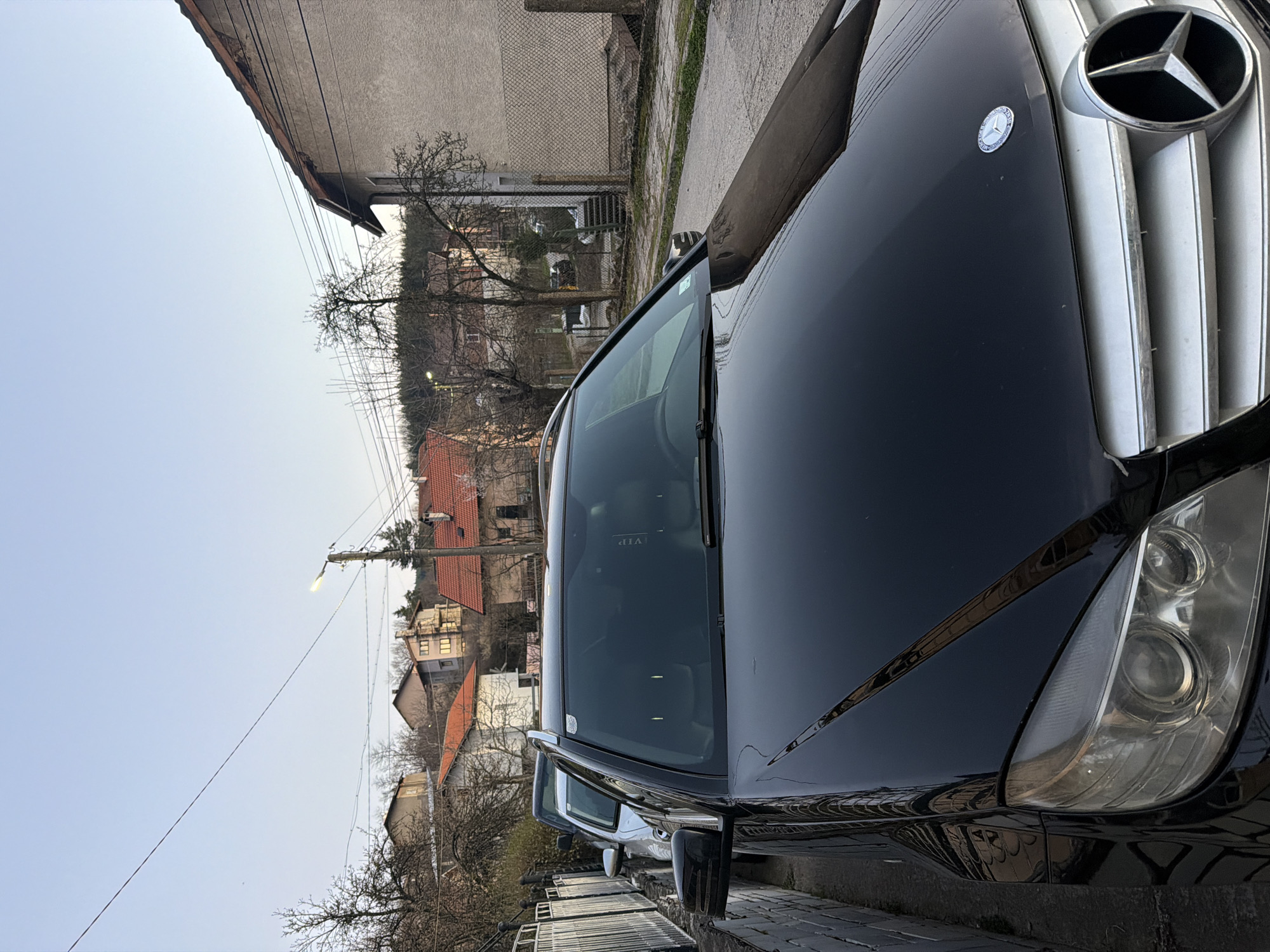 A black Mercedes-Benz car is parked on a street in Rudartsi, Bulgaria. The car is positioned on the right side of the frame, showcasing its hood, grill, and headlight. The background reveals houses with red-tiled roofs and trees. A lamppost and utility wires are visible against a light-blue sky. The foreground shows a bricked street.